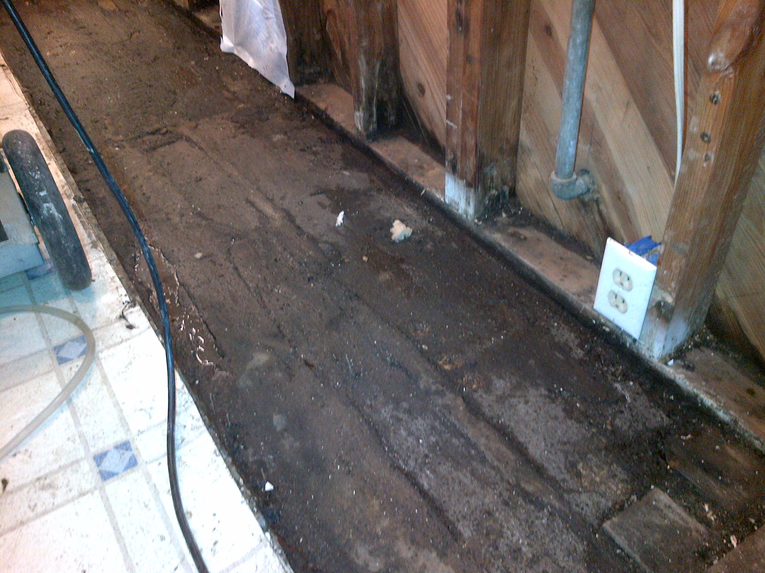 There is actually standing water in that excavated area. What you don’t see are all the bottom cabinets and the relocated appliances and sink. What you do see is gray water, muck, dirt, rotten plywood and exposed concrete slab. The plumbing has since been fixed, but now we get to reconstruct the kitchen after they pull up the rest of the floor to investigate the extent of the water damage under the linoleum. The house is 70 years old, but the kitchen was redone not all that long ago. Our renter’s coverage is taking care of moving out all of our kitchen items, having them disinfected and washed and the appliances relocated. No tellin’ what’s airborne at this point in that room. They even sealed it off with those contamination plastic flaps. So, we will likely be back in the house tomorrow or the next day (provided that the smell is finally gone) and eating from McDonalds for a week while they do the work.