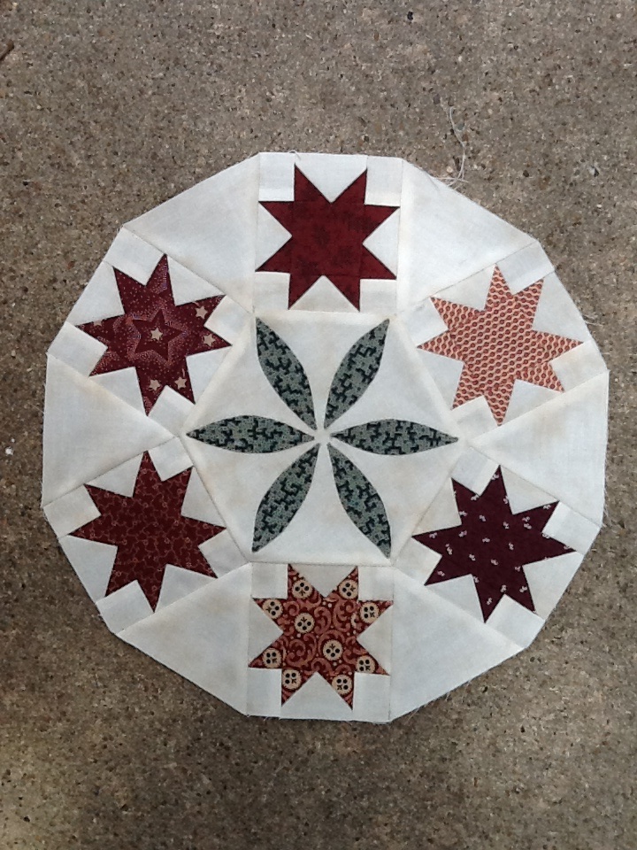So … blah, blah, blah – here is what I have accomplished!  I did the redo of the center circle on my Robin’s Nest from last time.  It is soooo much better and almost every point on my stars is clear and sharp!  Yay!!  I decided to join the stars to the hexagon first, then piece in the connecting triangles.