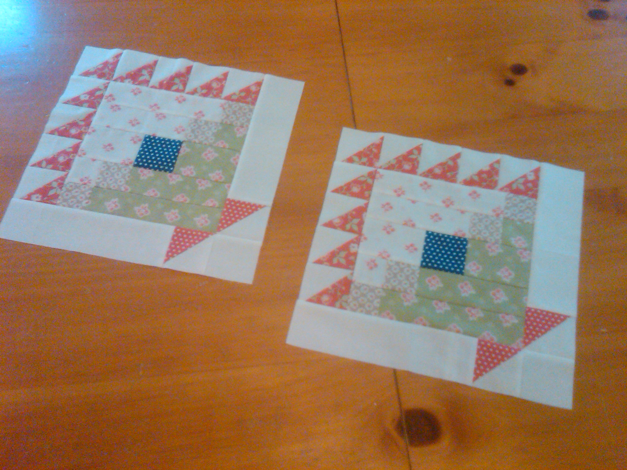 Here’s my first block. The quilt calls for 20 blocks to make the throw size blanket. I think it is going to come out great. In my attempt to take a better picture, I have this laid out in front of a glass door. It is fading the colors a bit, but I’ll share more when I have a few more blocks completed: