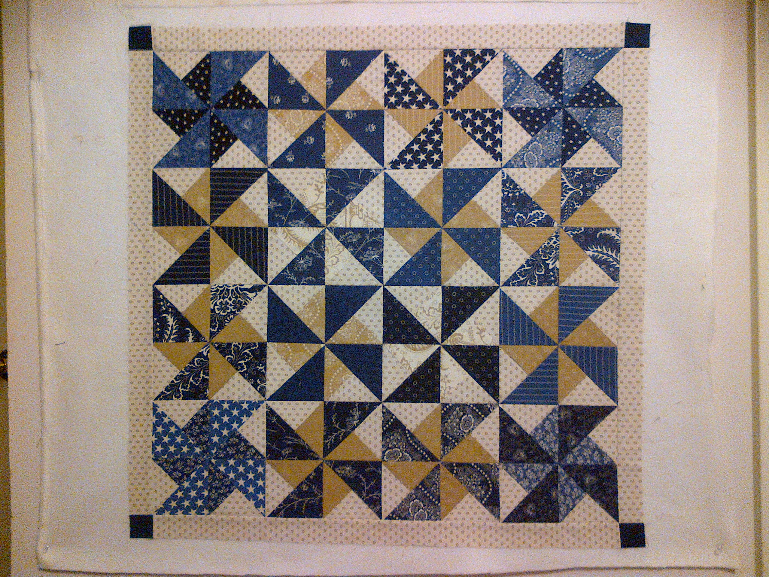 The finished size right now is right at 26″ square.  I used the better part of two charm packs of Indigo Crossing collection, and the background is a print from Jo Morton’s Sundays Best group.