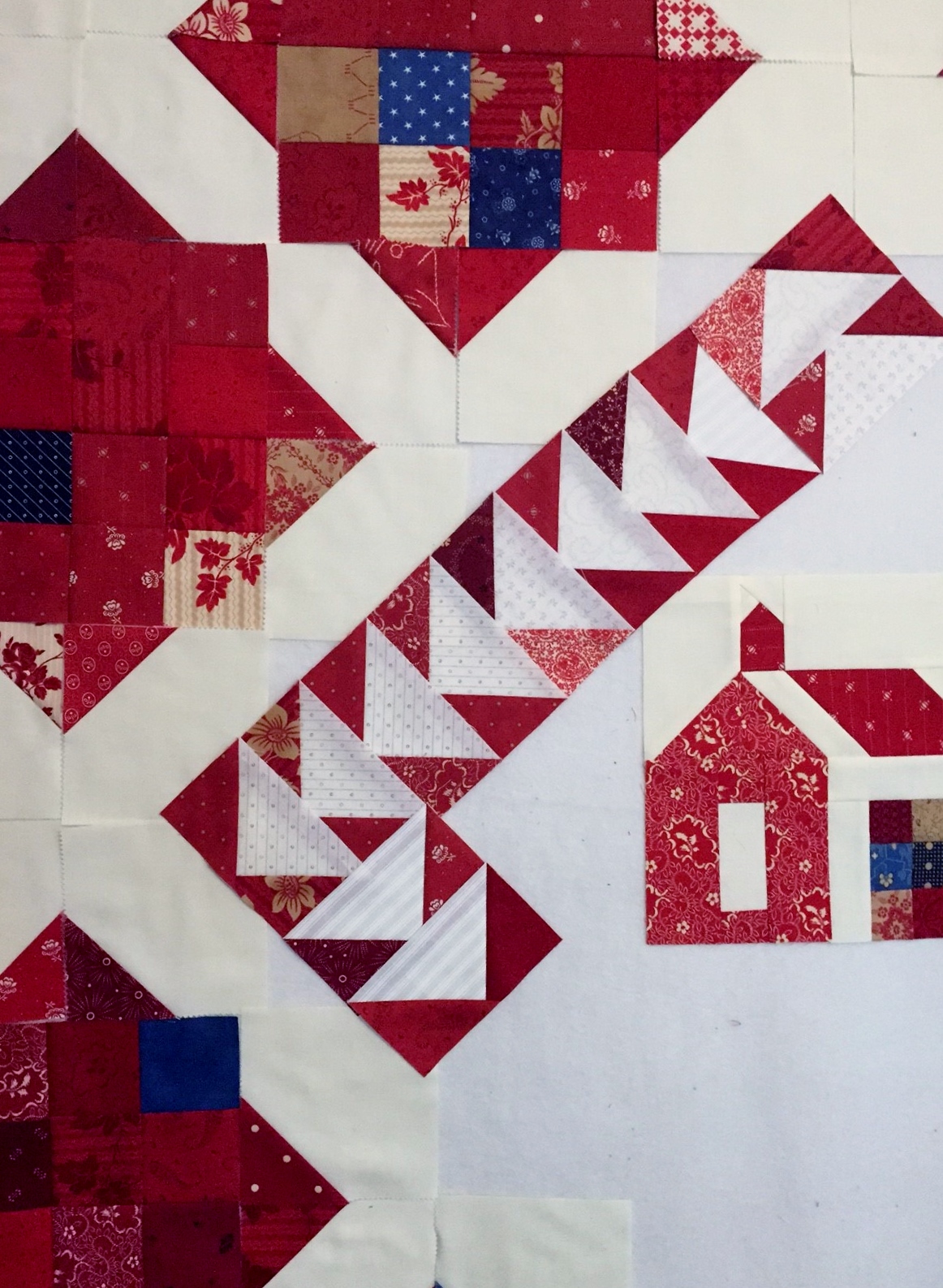 Hi Jennifer! Oh, that house block is perfect for the center! I also like the flying geese. They do look a little big now but they will look smaller when the seam allowances vanish.
