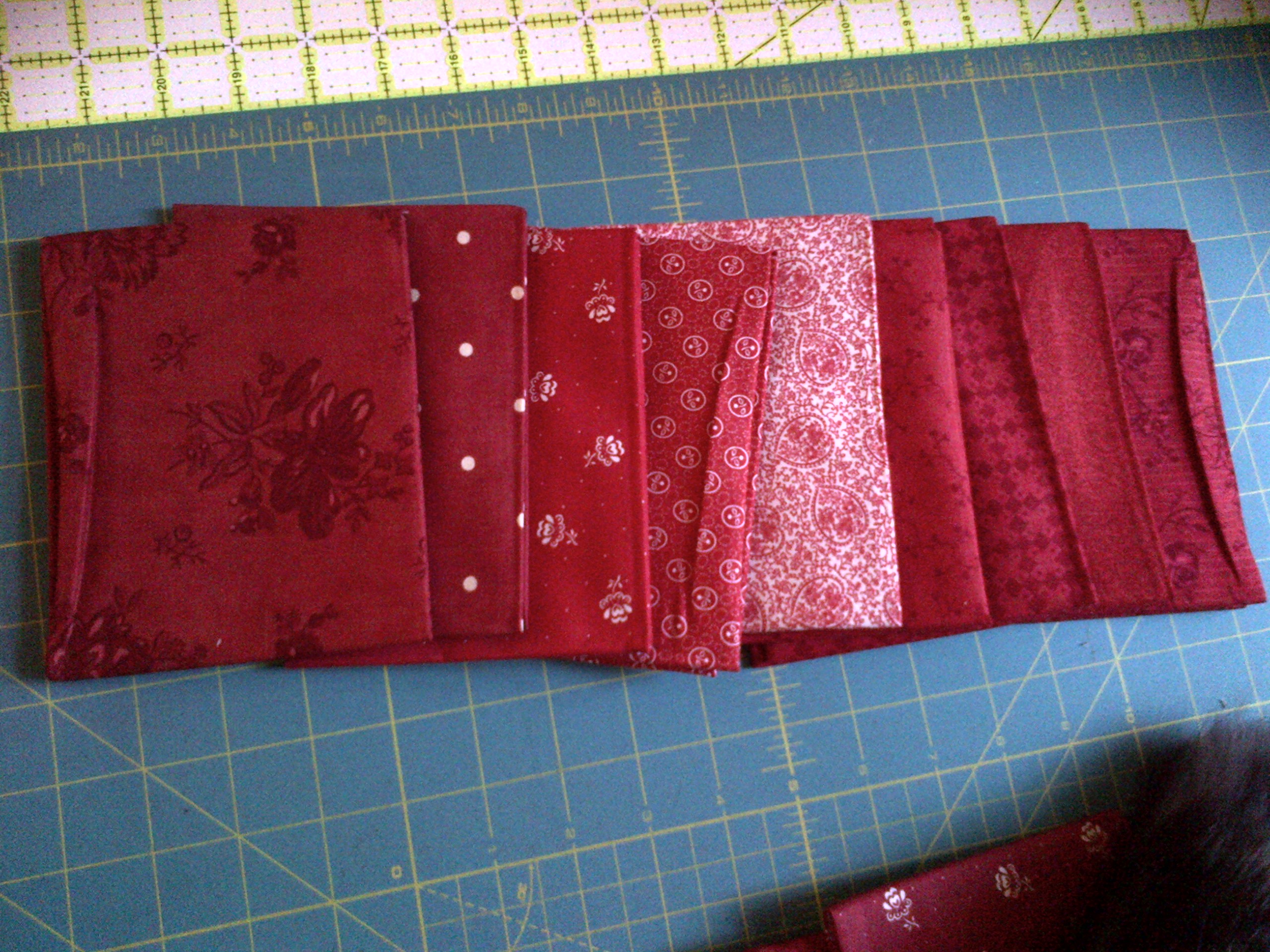 Now that Nantucket was completed, I am moving on to my other BOM projects. I am three months behind on the FQS DM BOM 2013 quilt. I started on Block 4 yesterday and have gotten the pieces cut out. Like the other months, I am cutting out two blocks from the one set of fabric. I was able to get everything I needed, but I had to add the smallest amount of background fabric, which I had from an earlier month.