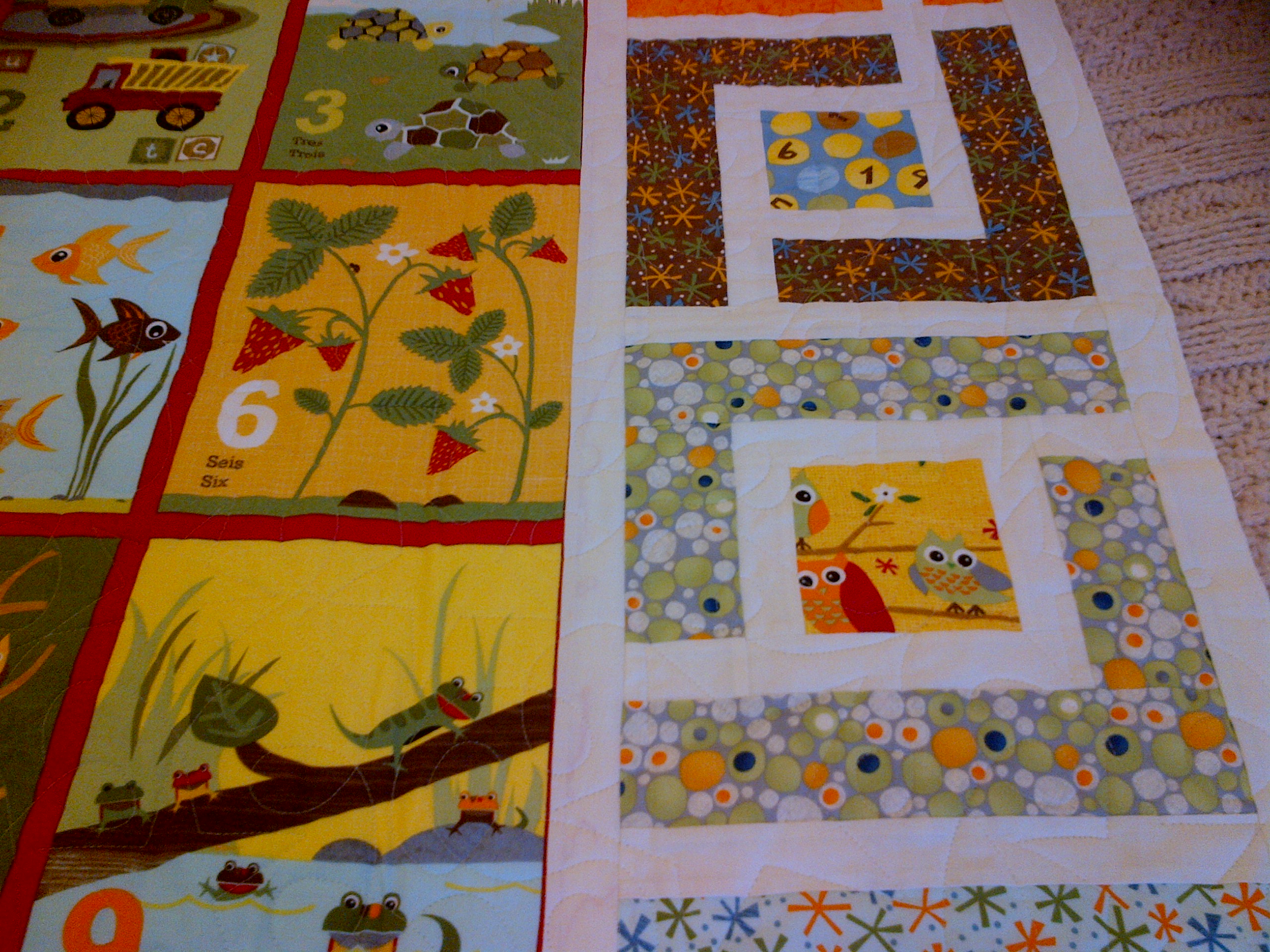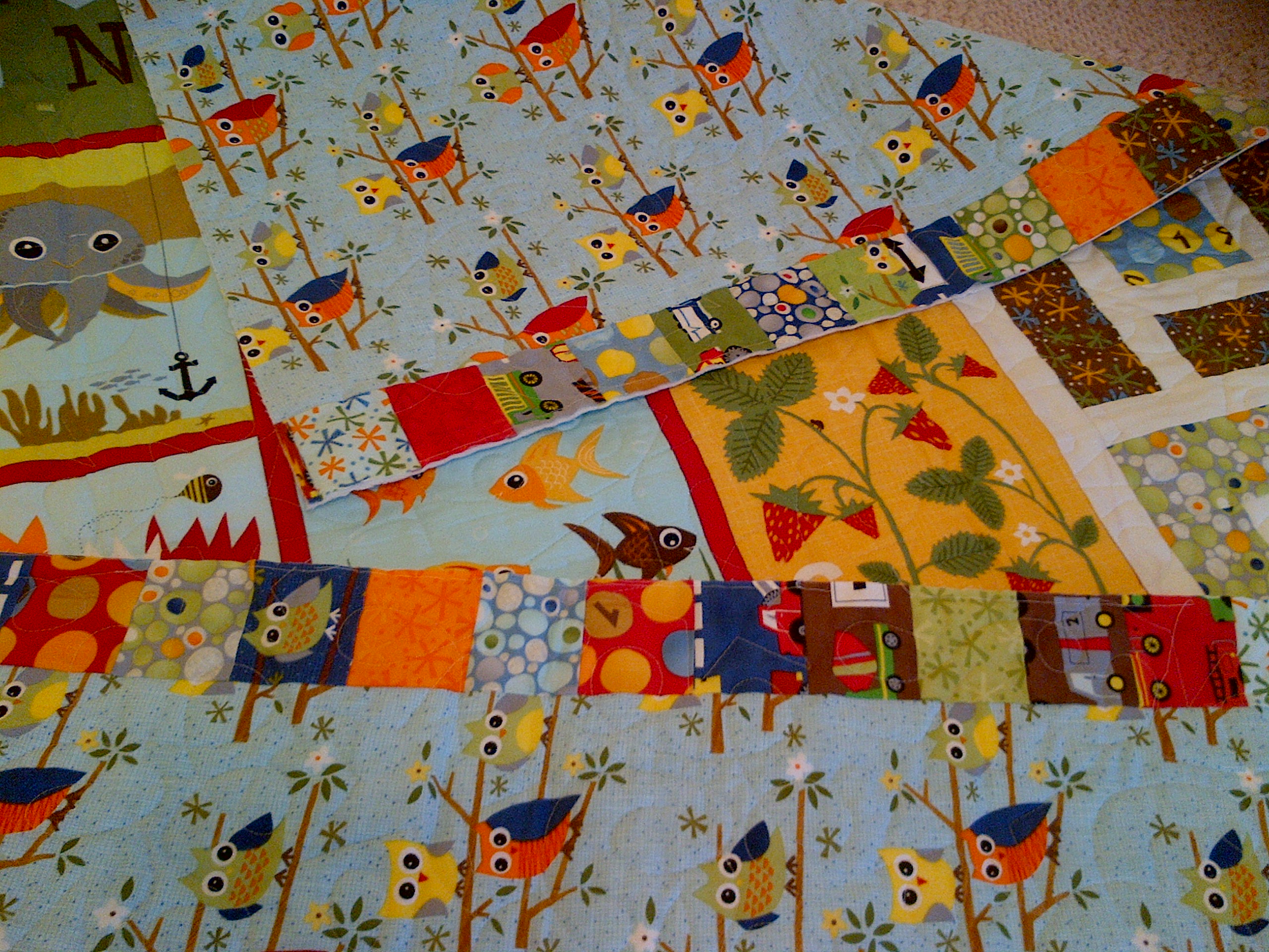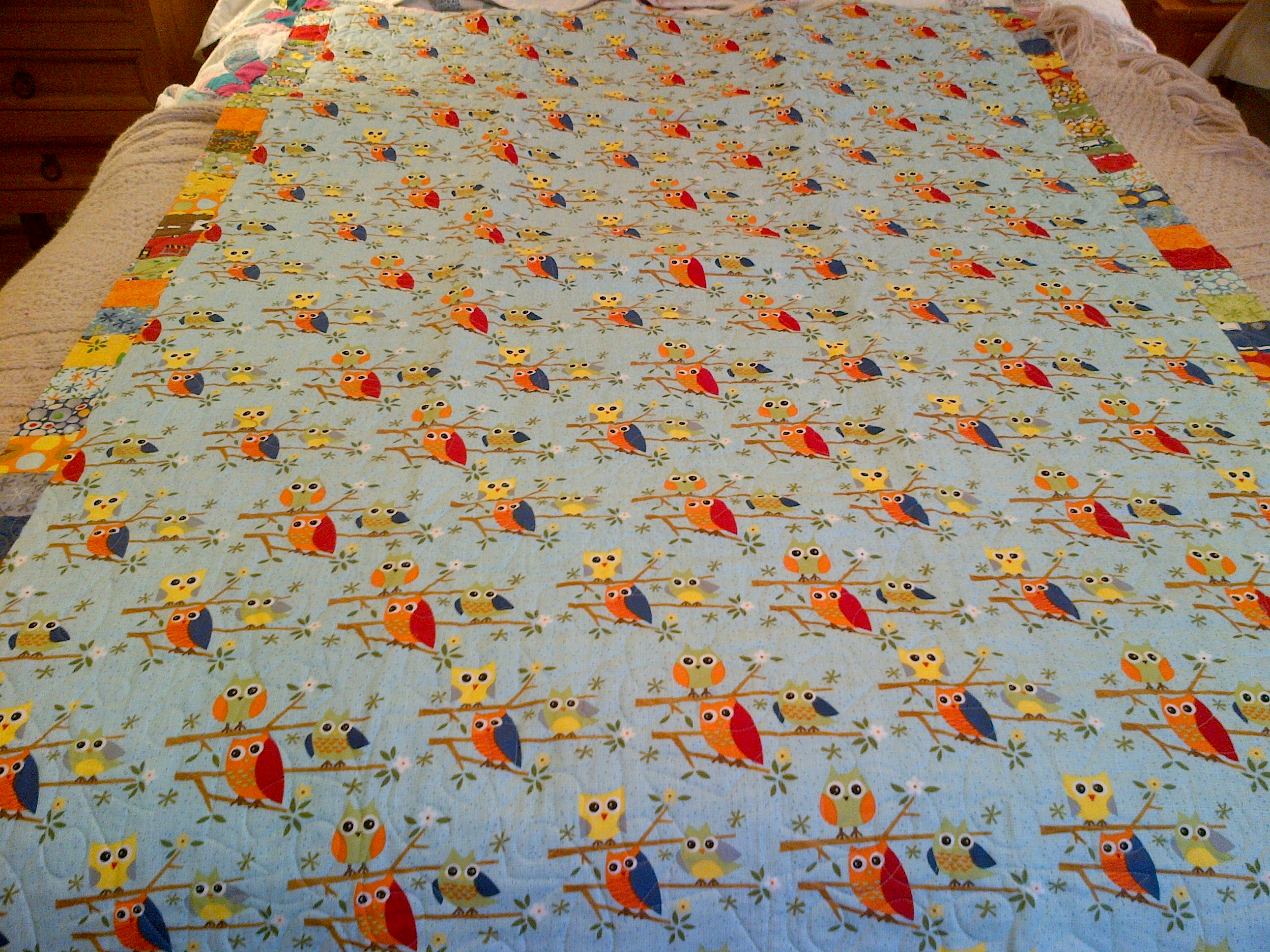 I really love the backing – these owls are the cutest! When I went to select my backing – it turned out the size of my quilt top was just past the width of fabric – around 46″. So… since I still had a variety of jelly roll strips leftover, I put them to good use in a piano key border on the backside. Once it was quilted and bound, it turned out looking like a perfect chain of squares.