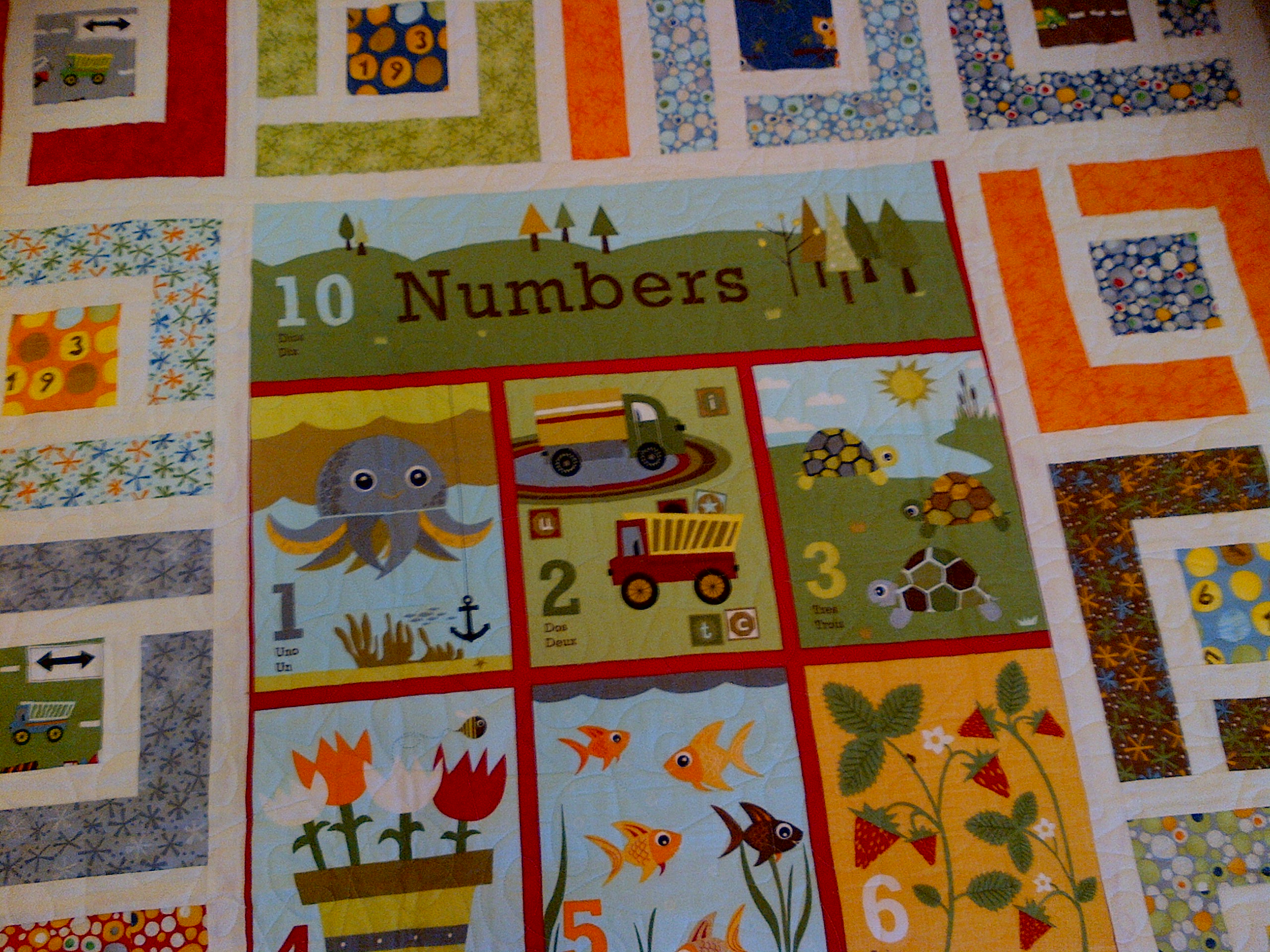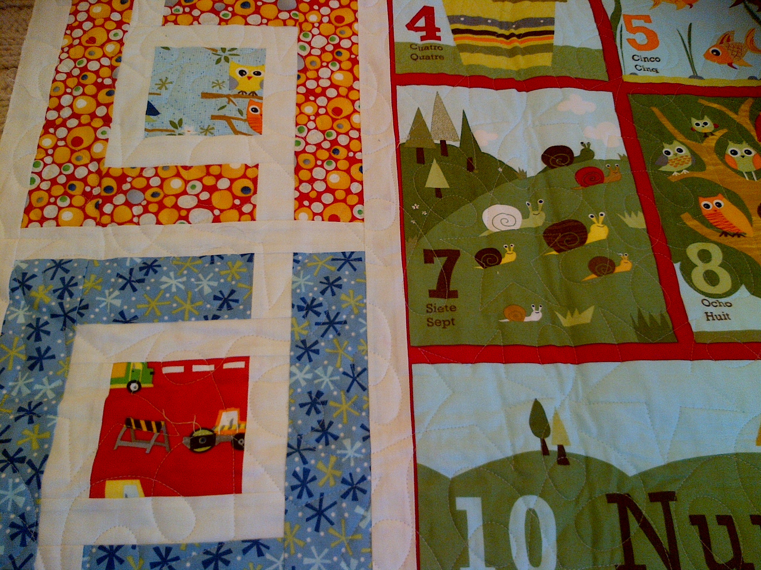 I love the feeling of a completed quilt top, but it does not beat the feeling I have when I call a quilt finished. For me, that means that someone can snuggle with it, wash it, use it, love it. My 10 Little Things quilt is now bequeathed to Brandon’s grandmother (my friend at work) and will be given to him at a family birthday party tomorrow night.