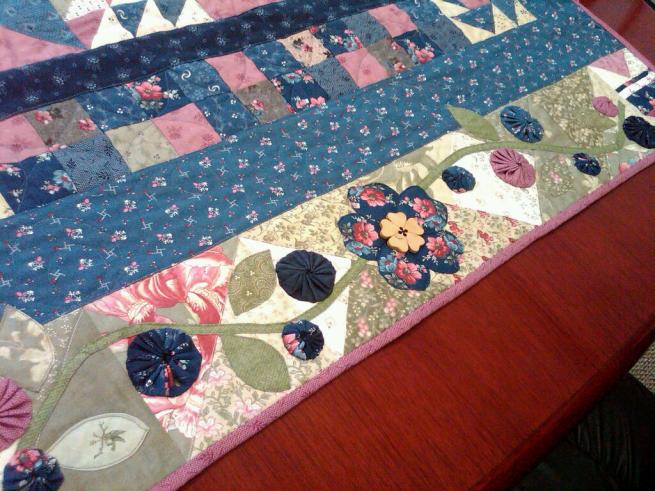 Another table runner that I made was documented extensively on my blog already … it was the quilt along I did with Pam Buda called “Forget Me Not”. Here’s the finished quilt runner, but you can click on my tags to the right and see all the posts relating to this quilt.