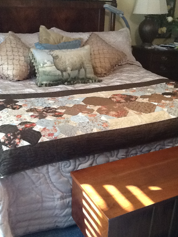 The colors go great with her neutral toned bedding. The fabric is Park Avenue by 3 Sisters and I got the pattern from the book “Bed Runners using Precut Fabrics” by Kathy Brown. My mother is also a retired English teacher, so I need to comment that I know I should underline book titles, but I don’t have that option in my free WordPress application.