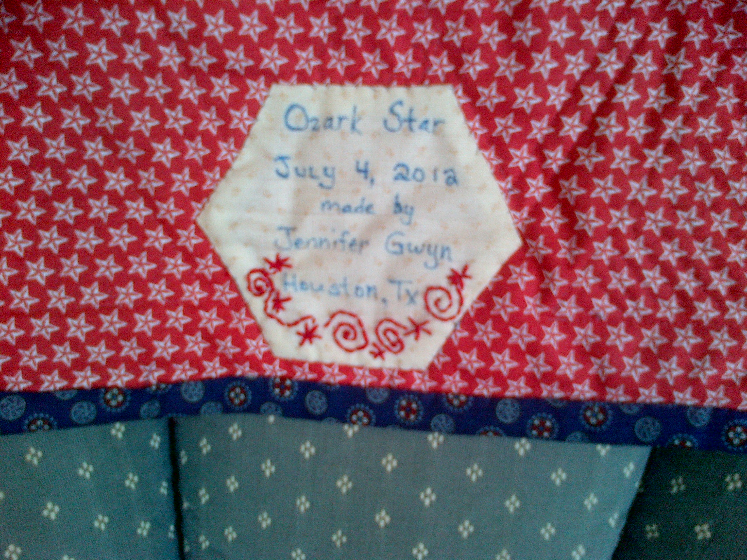 The next one to show you is a table topper I made her on July 4th, 2012. I started this project when I got home one night from work and stayed up all night to finish it, and free motion quilt it myself! I did the binding by hand and completed the label applique on the drive to her house that next morning.
