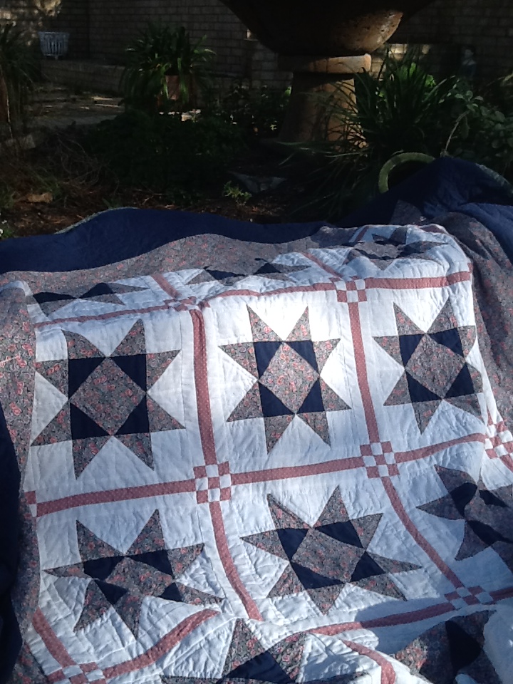 Thought I would also share a couple of pictures of my first completed quilt. I made it in 1990 or 1991 I think. During college, pieced a little over half of it by hand, and then the rest on a new Singer machine, cut the pieces by hand with a pencil and yardstick as my guides. No pattern really, just laid out the log cabin blocks in a ‘barn raising’ layout (?).
