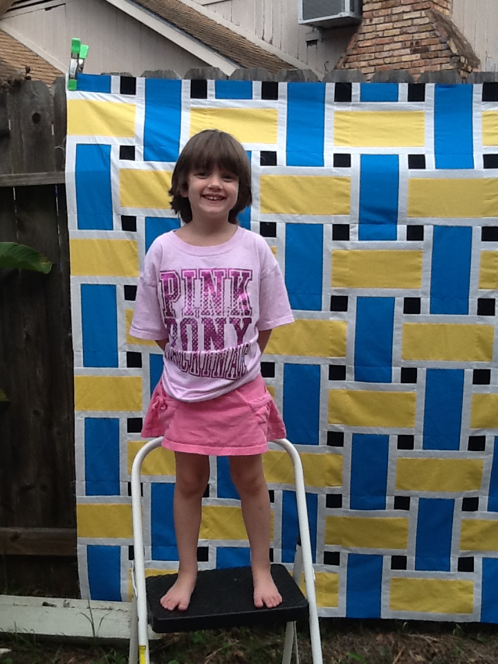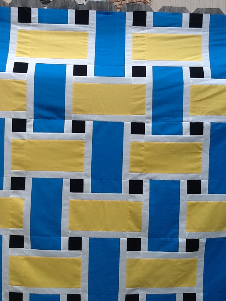 I got her to do a spiral square shape pantograph, which complemented the straight lines and squares on the quilt front. Here’s a reminder of what the front of the quilt looked like (before quilting) and a picture of the back which shows the quilt motif.
