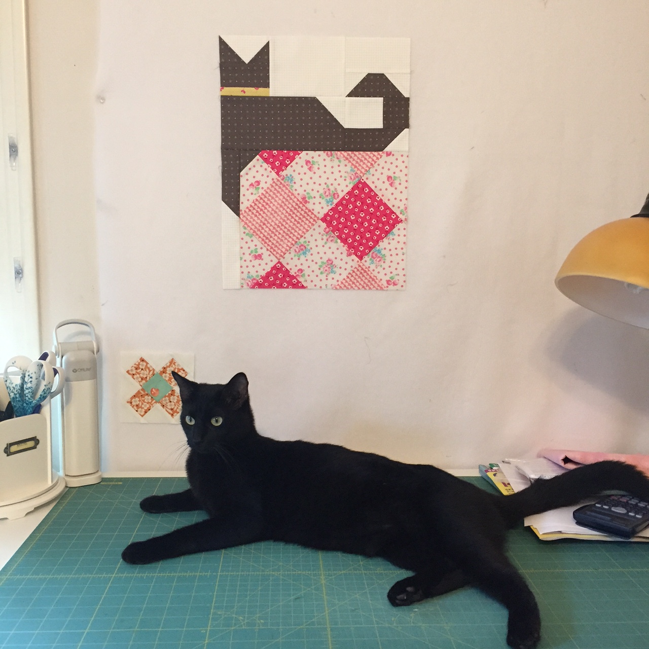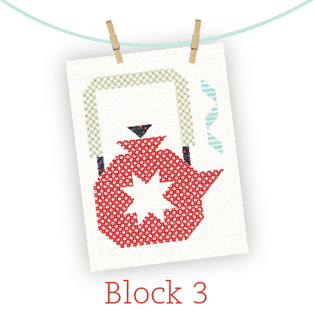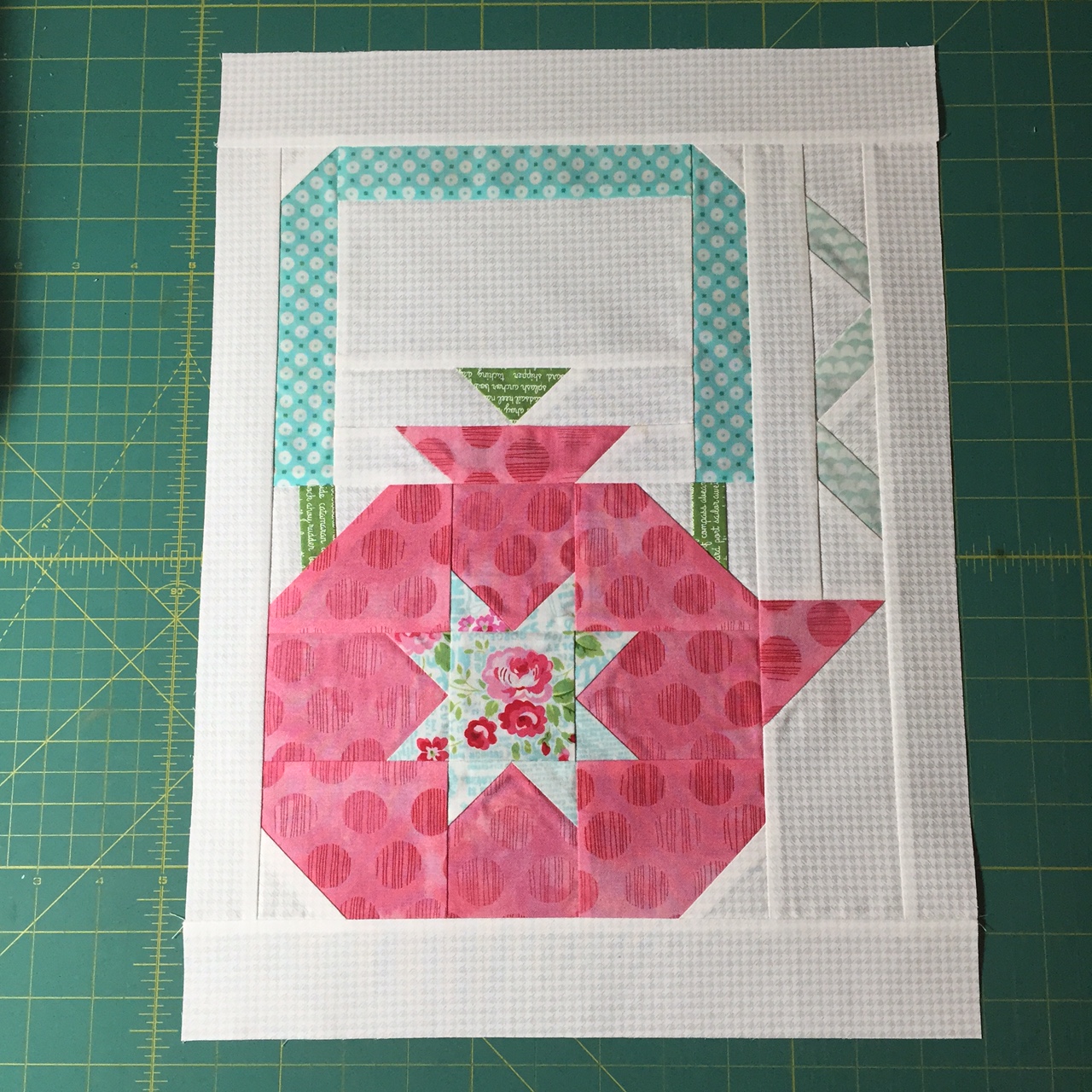 One step in the pattern is to cut squares from the background and from another fabric for the picnic handles. I didn’t have a square big enough, but I could look ahead to see I would be wasting the corners off the square anyway…