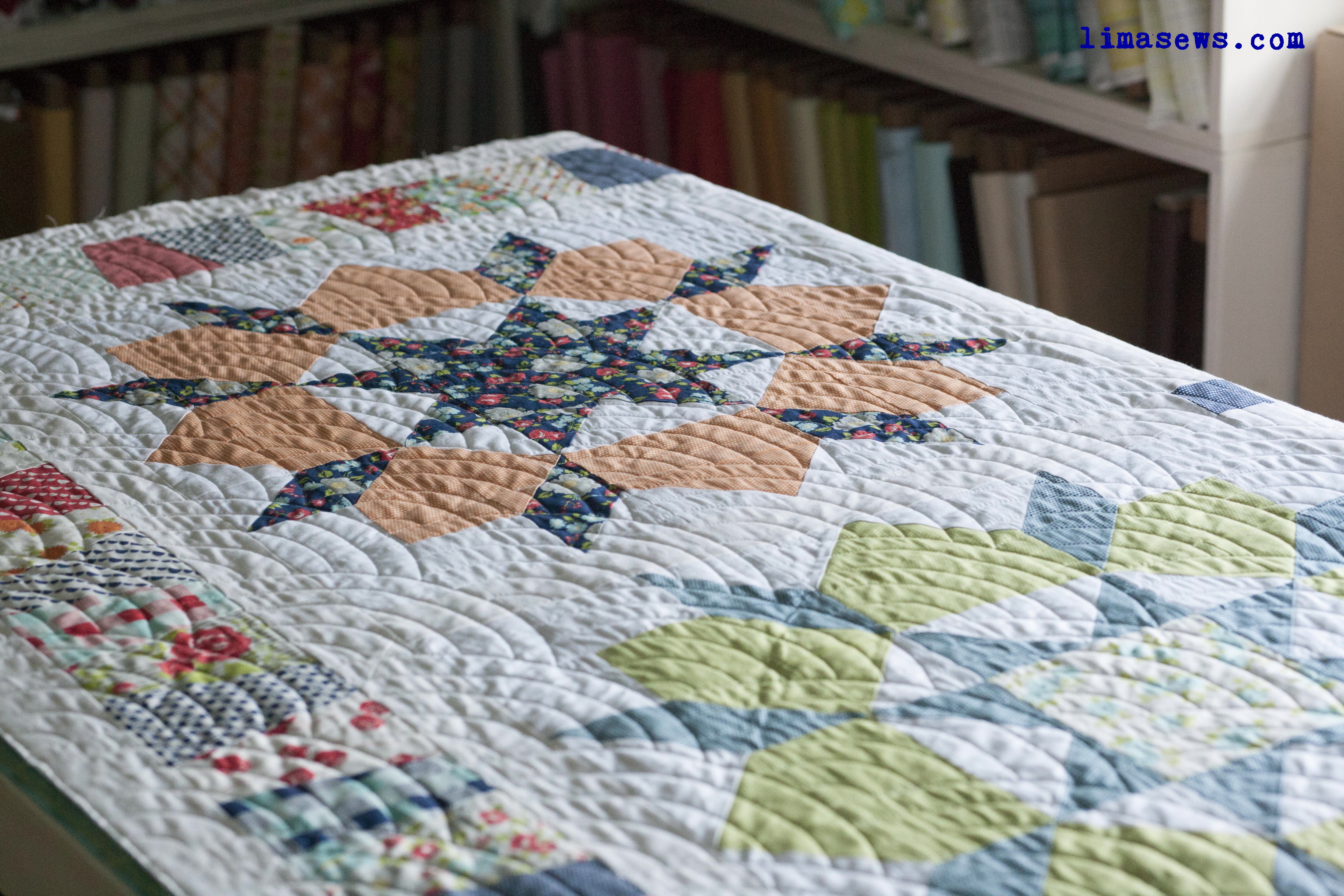 This was the Fat Quarter Shop Designer Mystery BOM from 2011. It features Strawberry Fields fabric from Fig Tree Quilts. I used one of those prints for the backing. My daughter loves all things pink! Here are some more pictures: